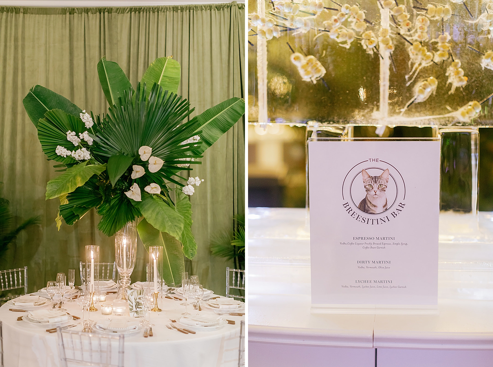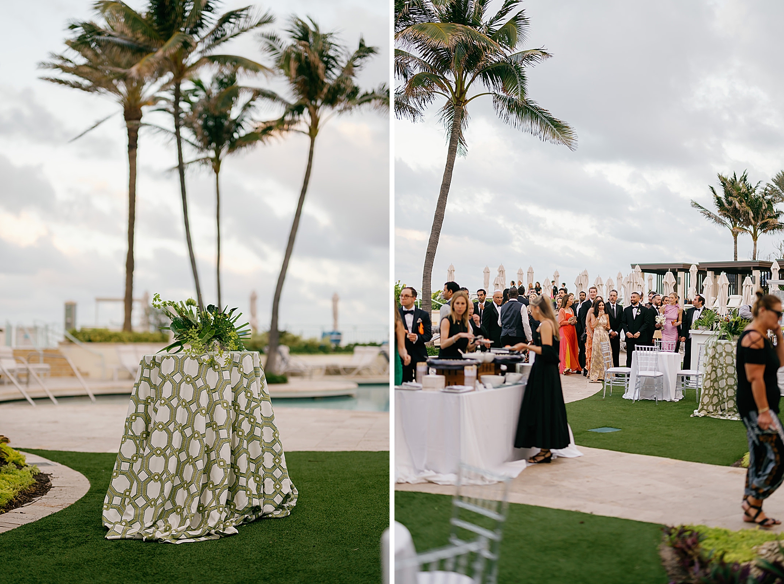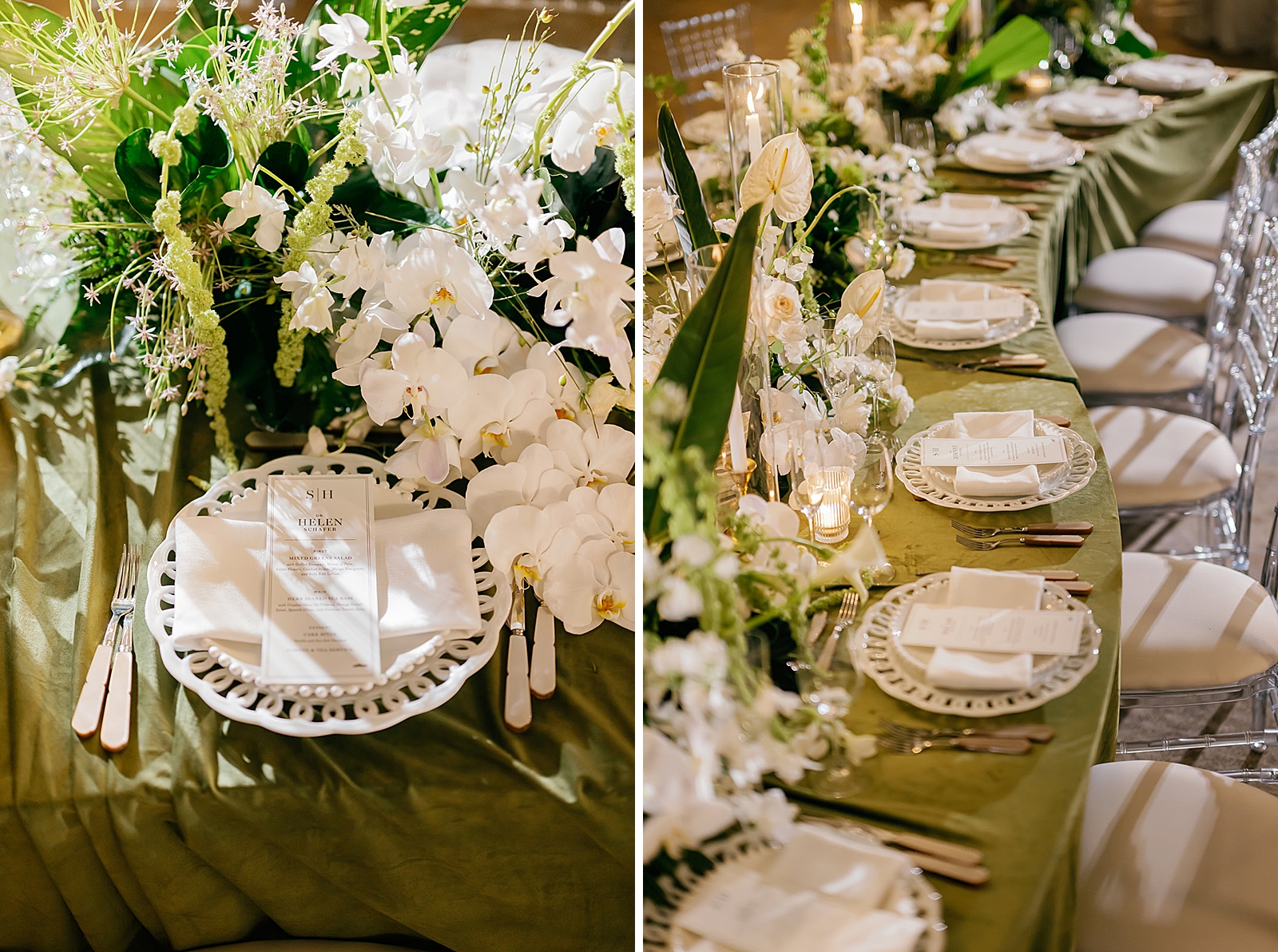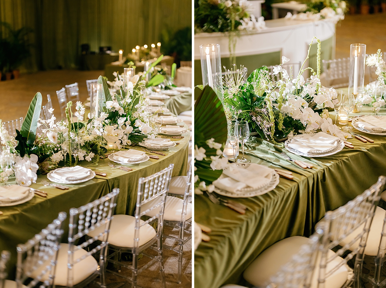 The design, curated by The Golden Pineapple Event Company, leaned into a fresh, verdant color palette—a reflection of the couple’s shared love of green and the tropical elegance of Eau Palm Beach. Lush greenery, crisp whites, and touches of gold gave the weekend a modern yet organic look, with every space—from ceremony to reception—evoking the beauty of South Florida’s coastline.