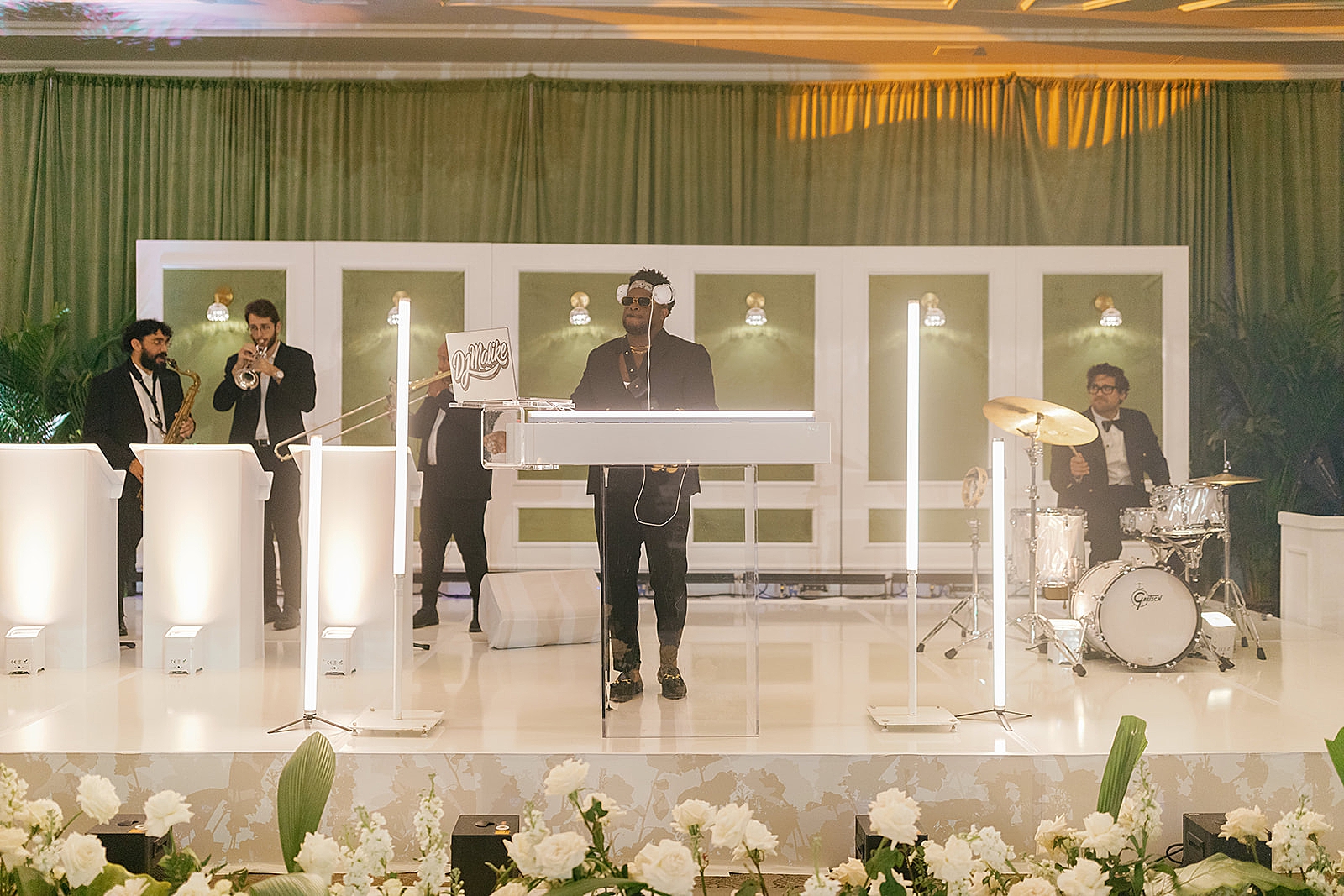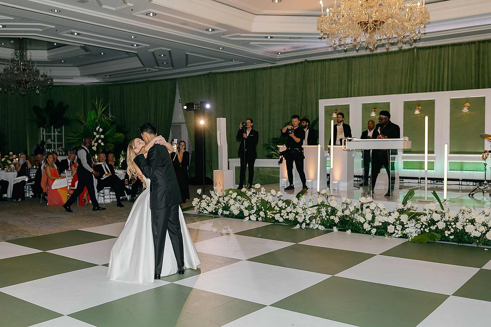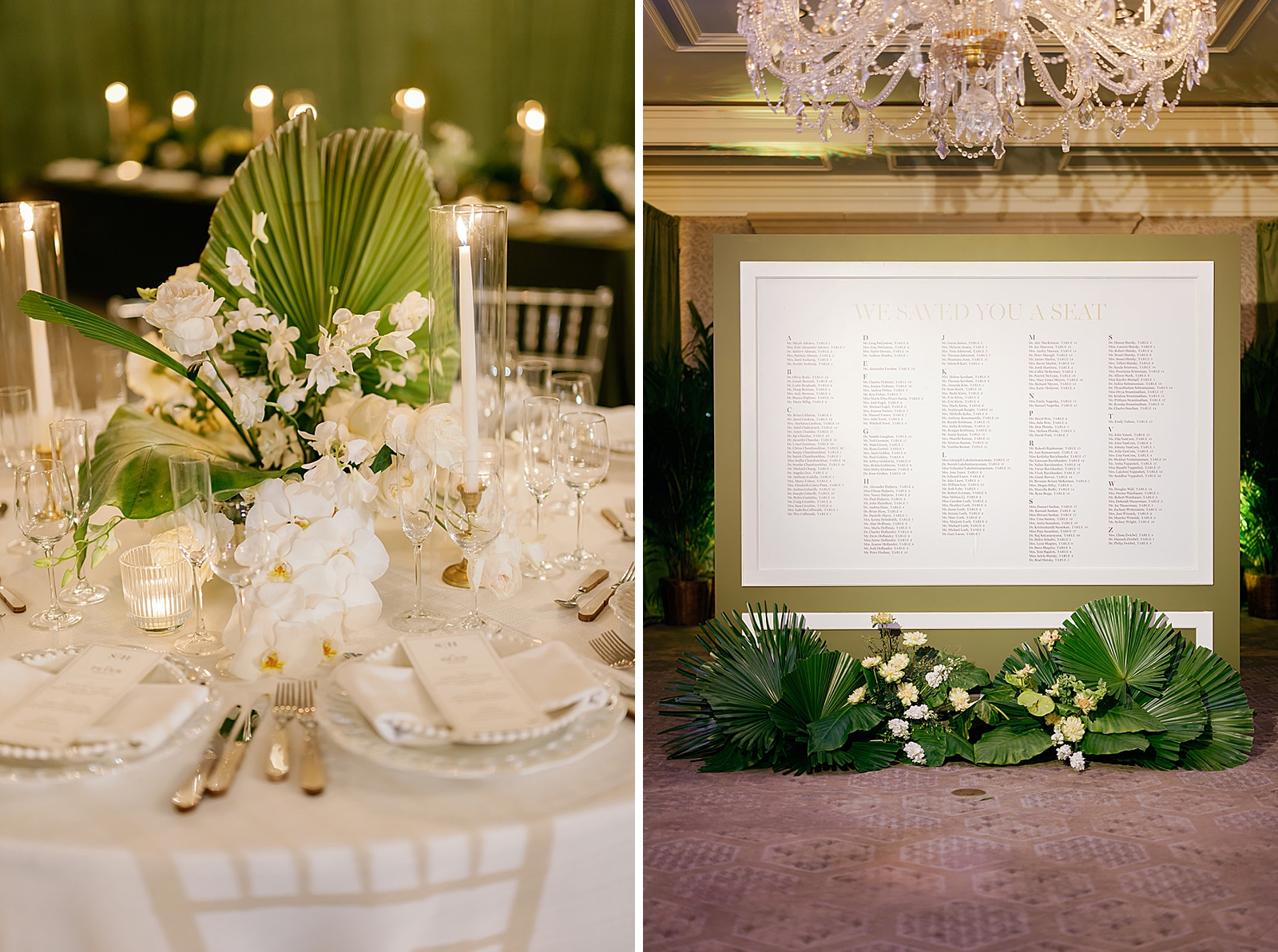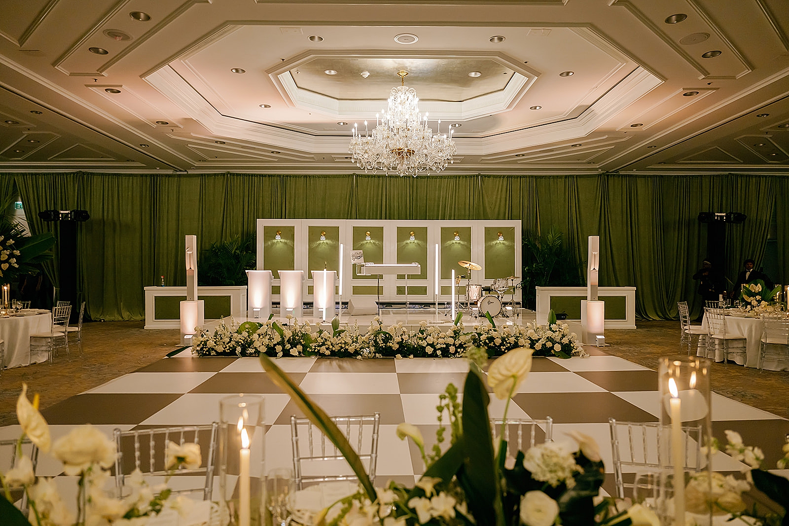 The design, curated by The Golden Pineapple Event Company, leaned into a fresh, verdant color palette—a reflection of the couple’s shared love of green and the tropical elegance of Eau Palm Beach. Lush greenery, crisp whites, and touches of gold gave the weekend a modern yet organic look, with every space—from ceremony to reception—evoking the beauty of South Florida’s coastline.