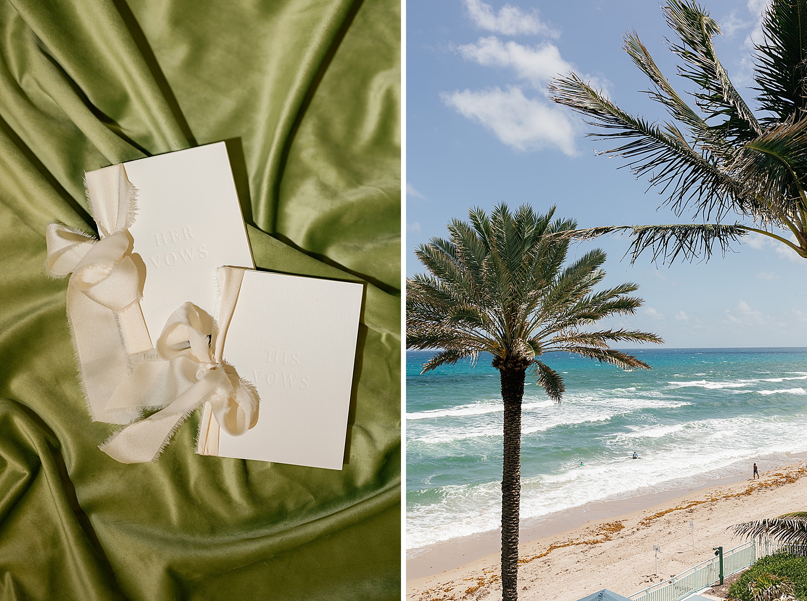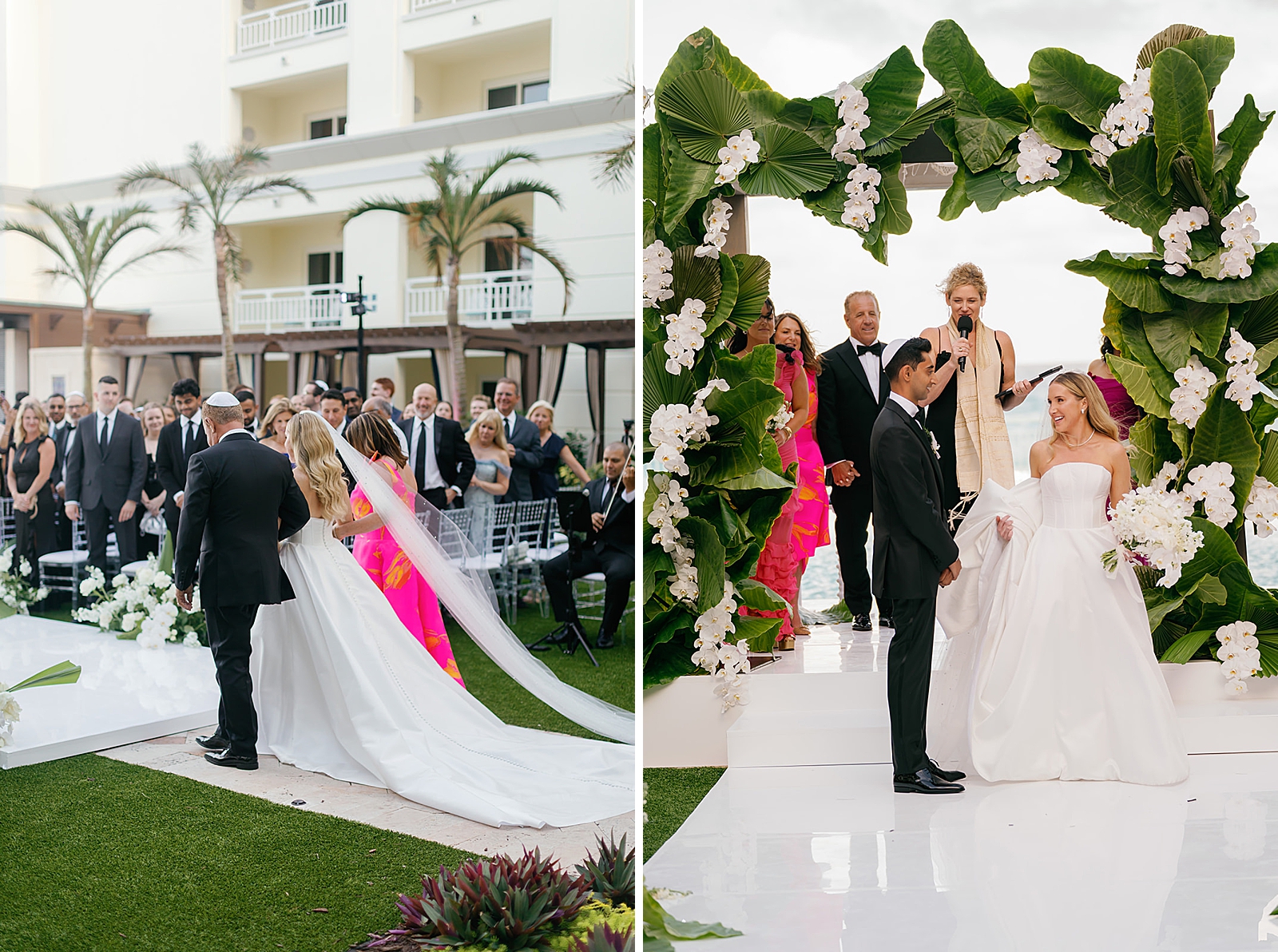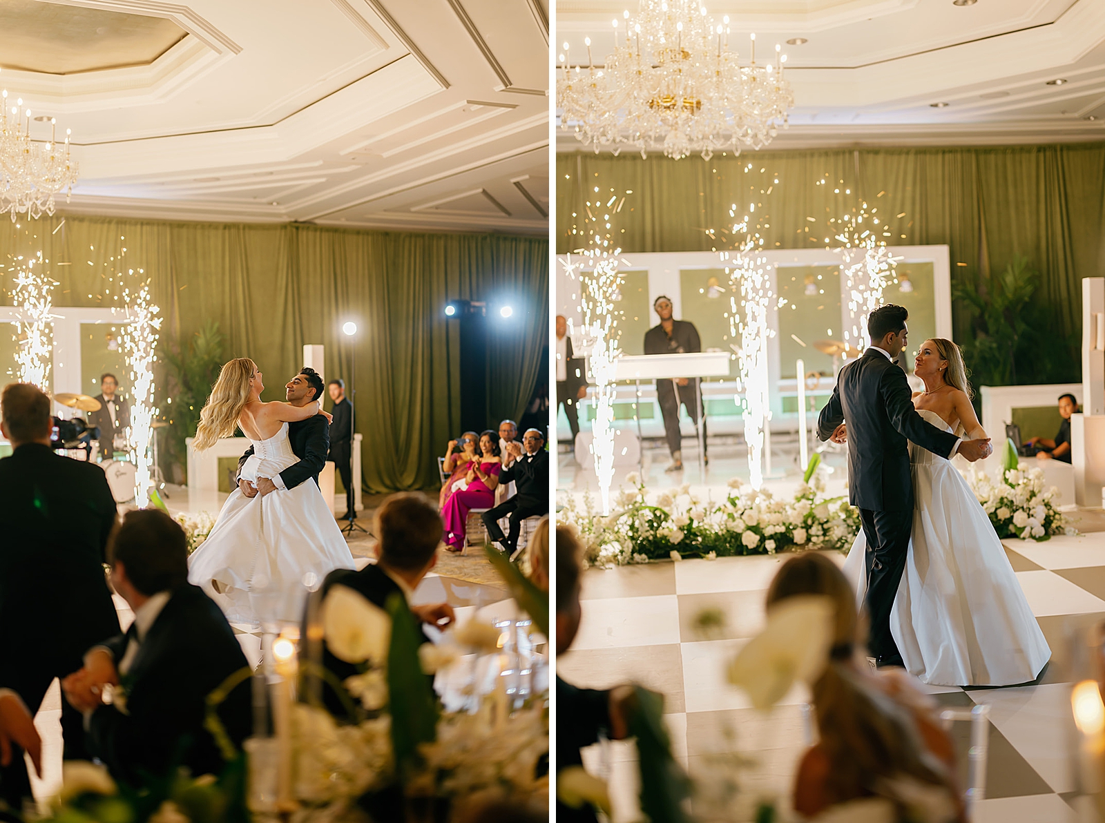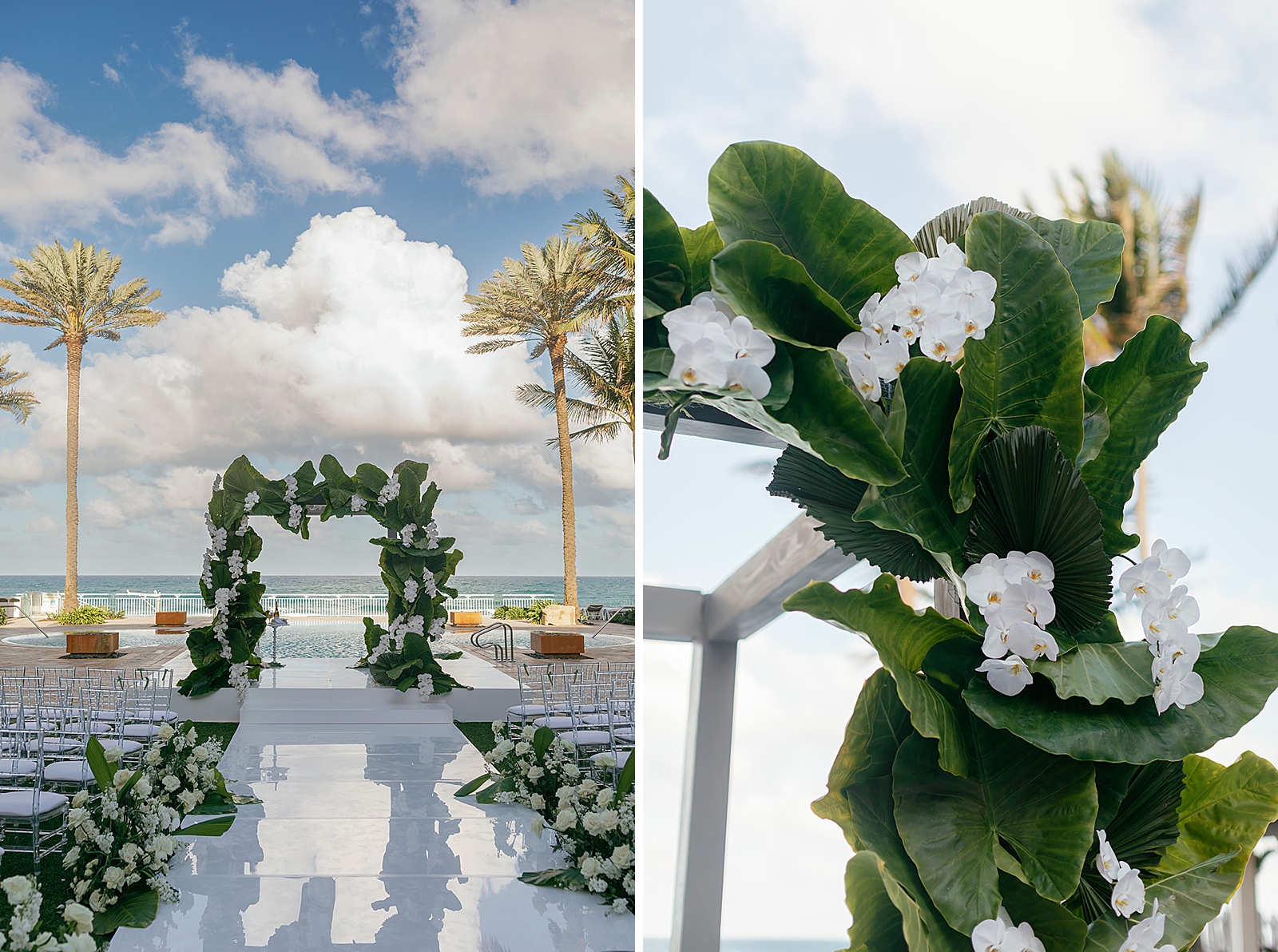 The design, curated by The Golden Pineapple Event Company, leaned into a fresh, verdant color palette—a reflection of the couple’s shared love of green and the tropical elegance of Eau Palm Beach. Lush greenery, crisp whites, and touches of gold gave the weekend a modern yet organic look, with every space—from ceremony to reception—evoking the beauty of South Florida’s coastline.