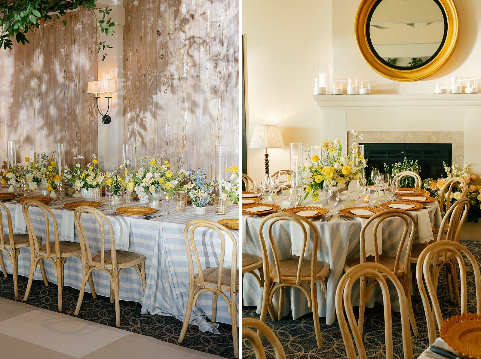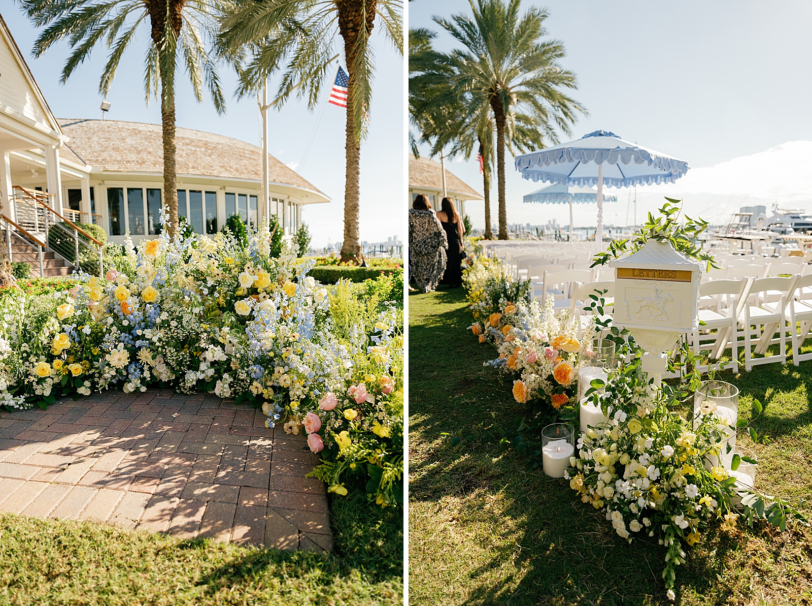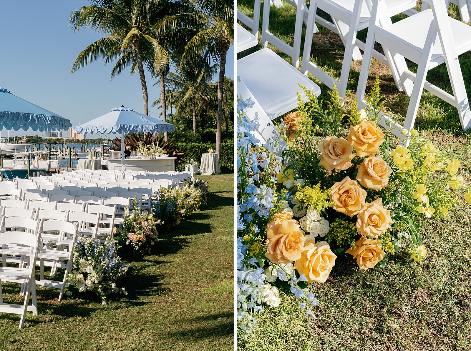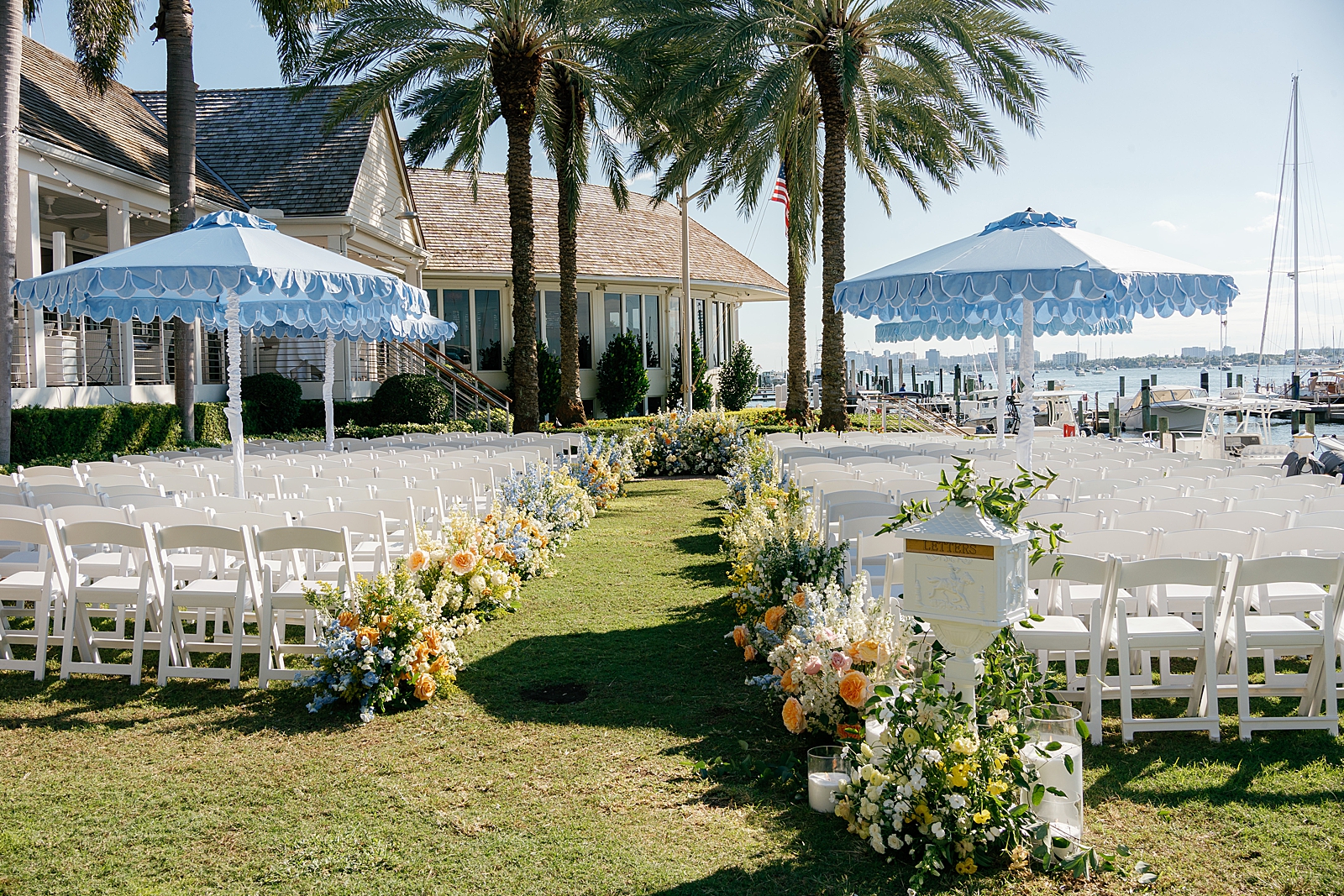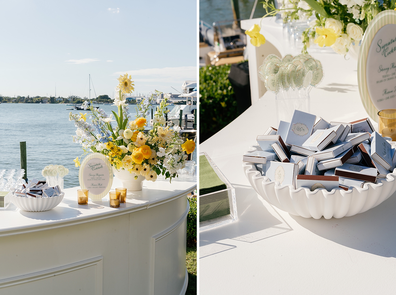 The couple chose a charming color palette of soft yellows, peaches, light blues, and crisp whites. These tones brought a warm, sun-kissed energy to the day, complementing the natural beauty of Palm Beach’s waterfront. Florals, textiles, and stationery all echoed this palette, creating a cohesive atmosphere that felt both fresh and timeless.
