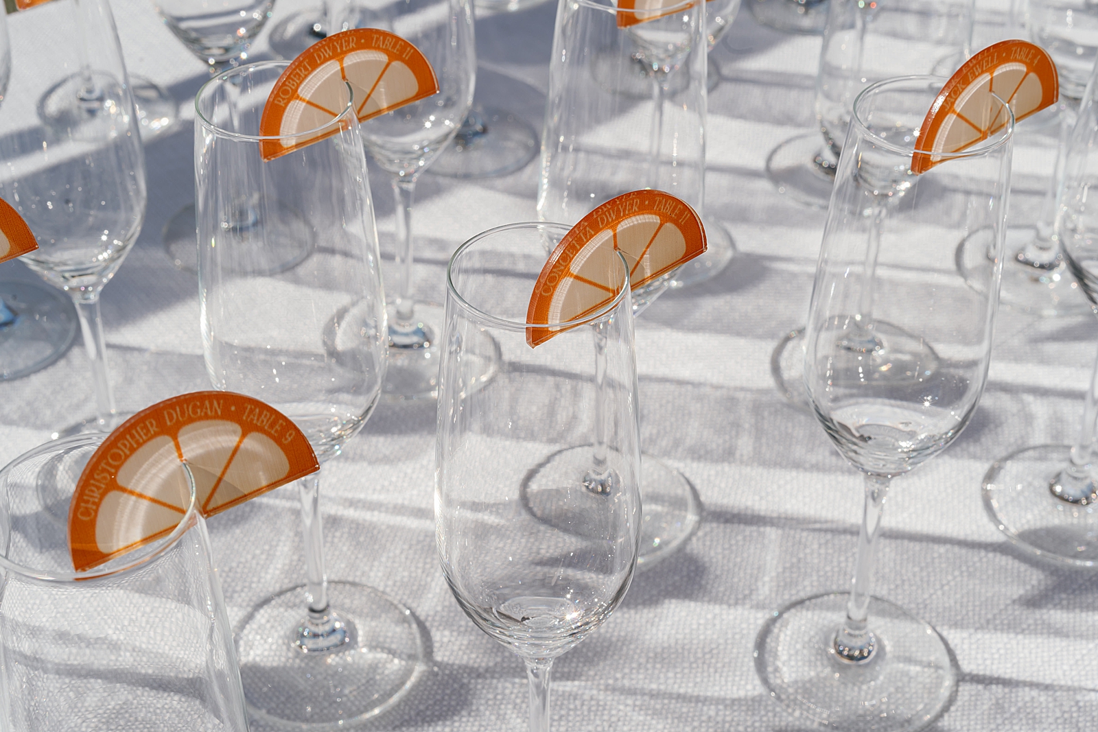 One of the sweetest design moments? The orange slice escort cards perched on champagne glasses. Not only did they add a bright pop of color, but they also brought a touch of playful Florida flair guests absolutely loved.