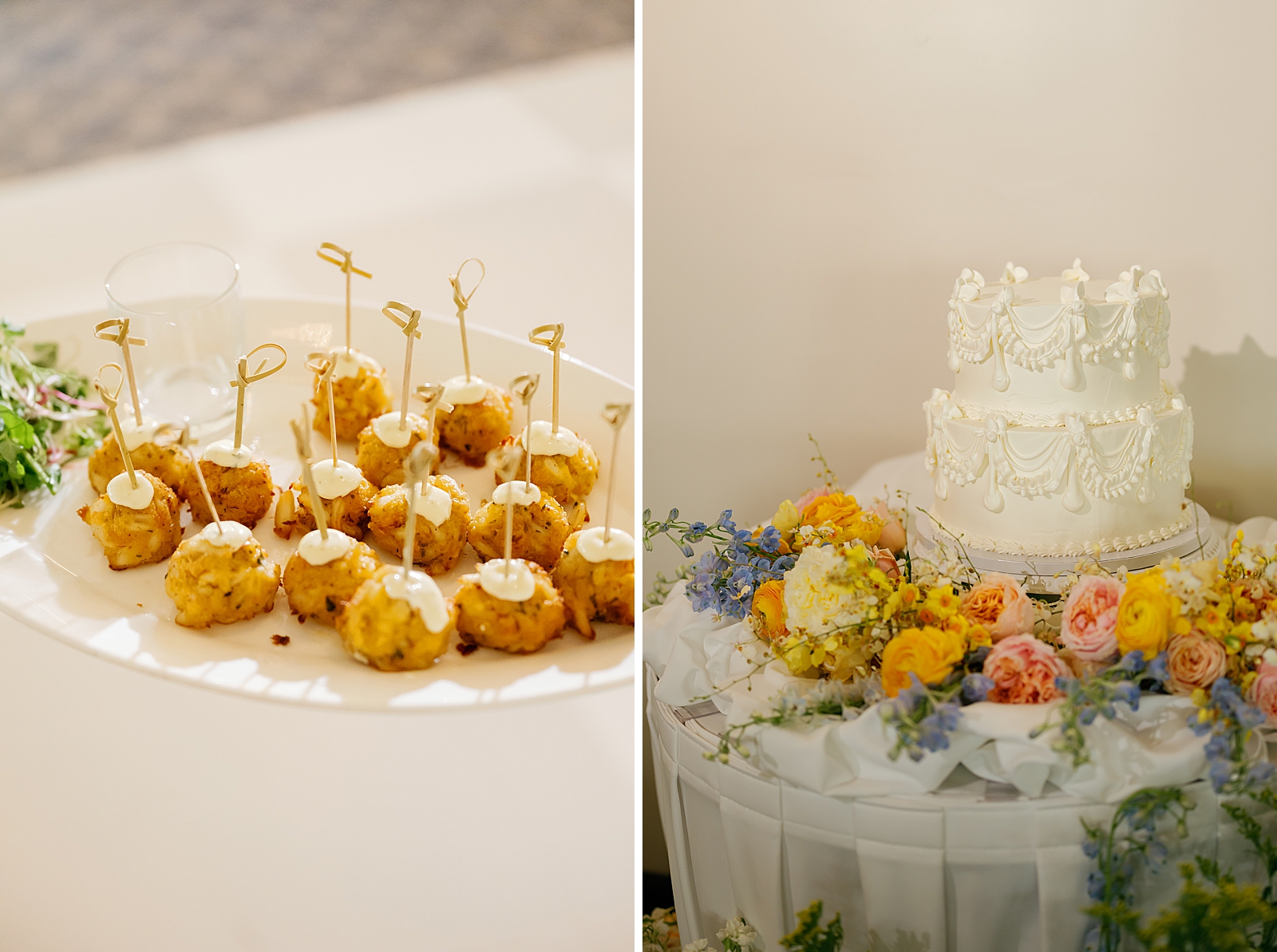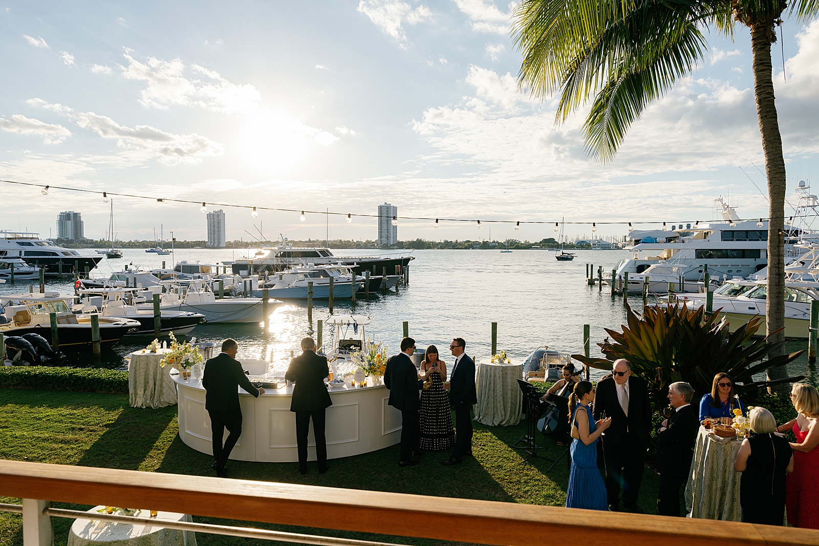 Following the ceremony, guests enjoyed an outdoor cocktail hour where the warm palette and waterfront views continued to shine. Signature drinks, laughter, and golden-hour sunshine made this portion of the day feel relaxed and celebratory — the perfect bridge between vows and reception.