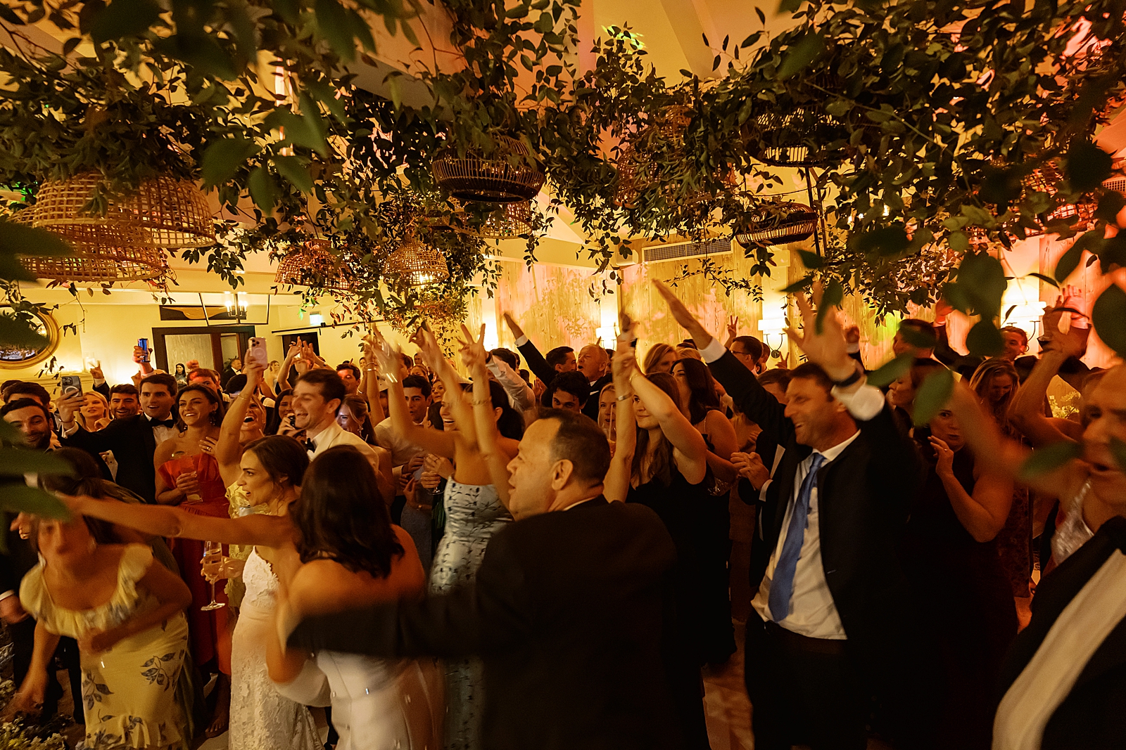 When it came time for the reception, the party moved indoors, where a live band kept the atmosphere lively from the very first song. They played through dinner and dancing, creating a dynamic, energetic flow that kept guests on their feet all night long. Elegant tablescapes, glowing candles, and the couple’s soft color palette brought warmth into the room, while the band ensured pure fun.