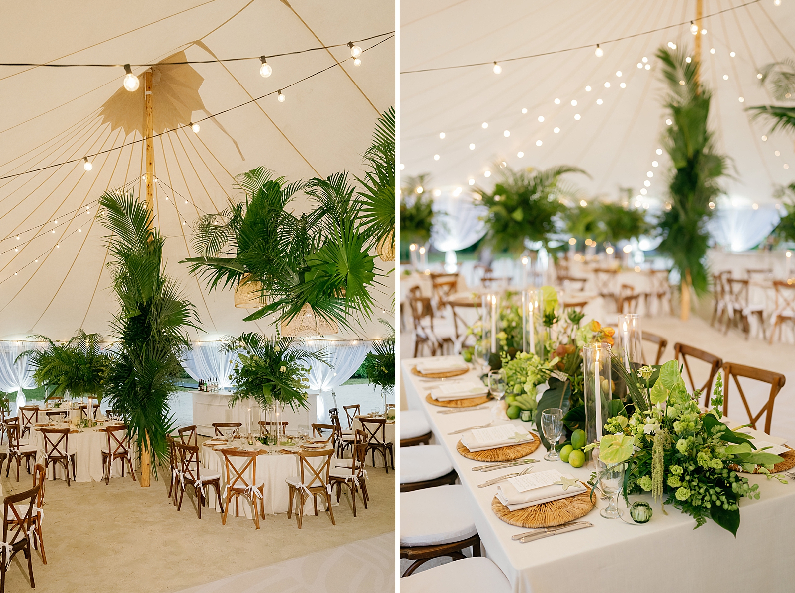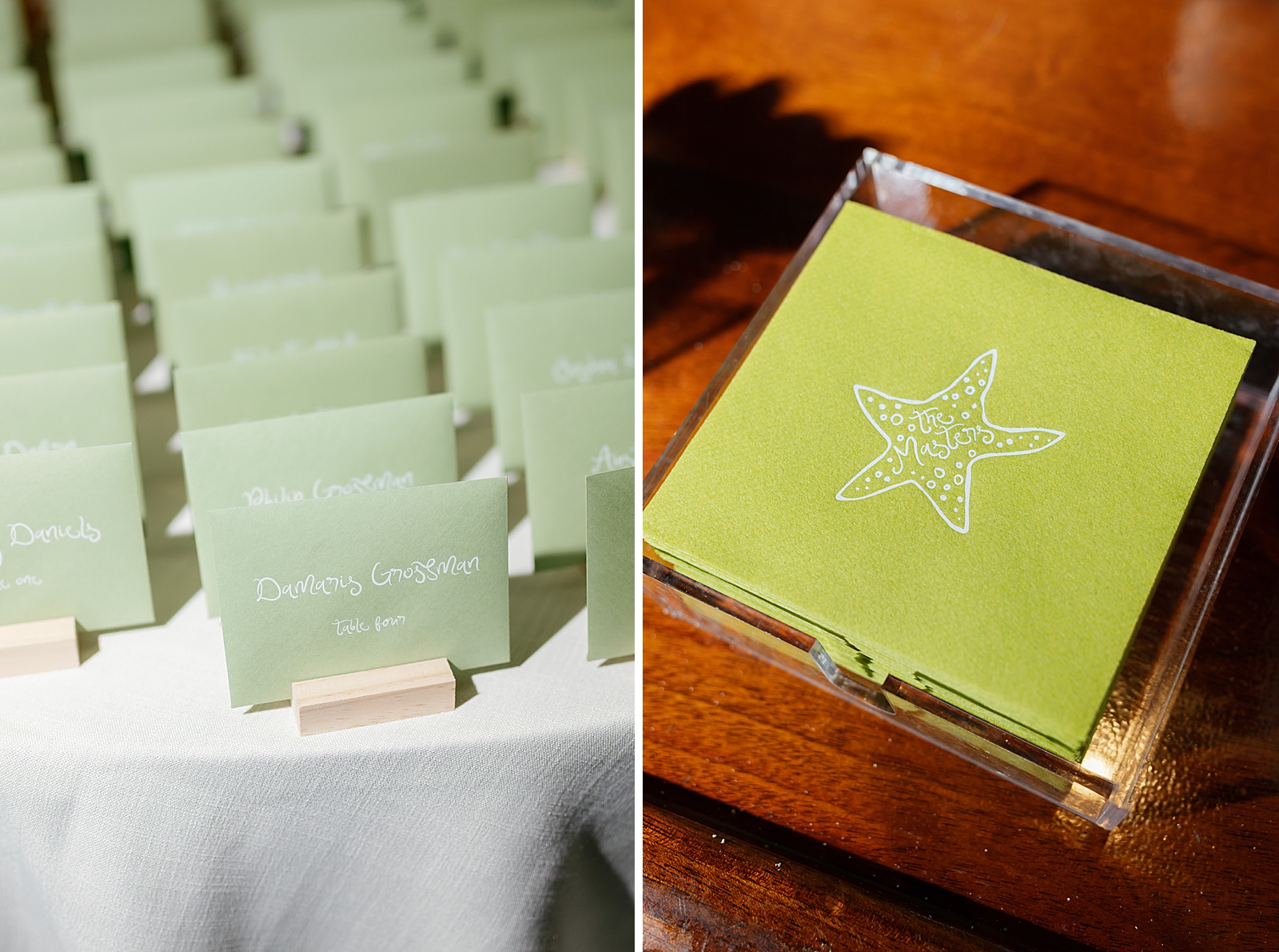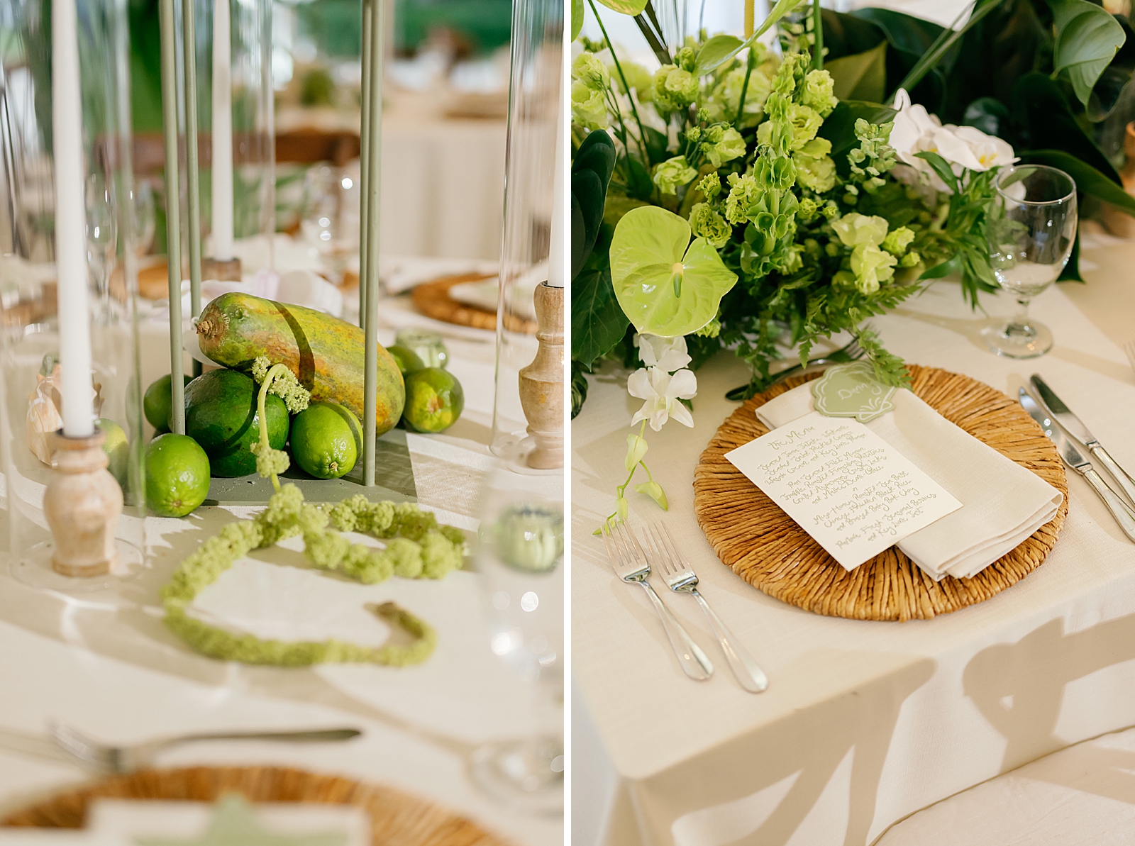 The design palette leaned into timeless coastal elegance: layered shades of green and white, warm rattan textures, and organic elements that felt perfectly at home by the sea. Every detail was intentional yet relaxed—elevated without feeling overdone. One standout design moment was the custom dance floor wrap, which added a personalized and polished touch to the reception space.
