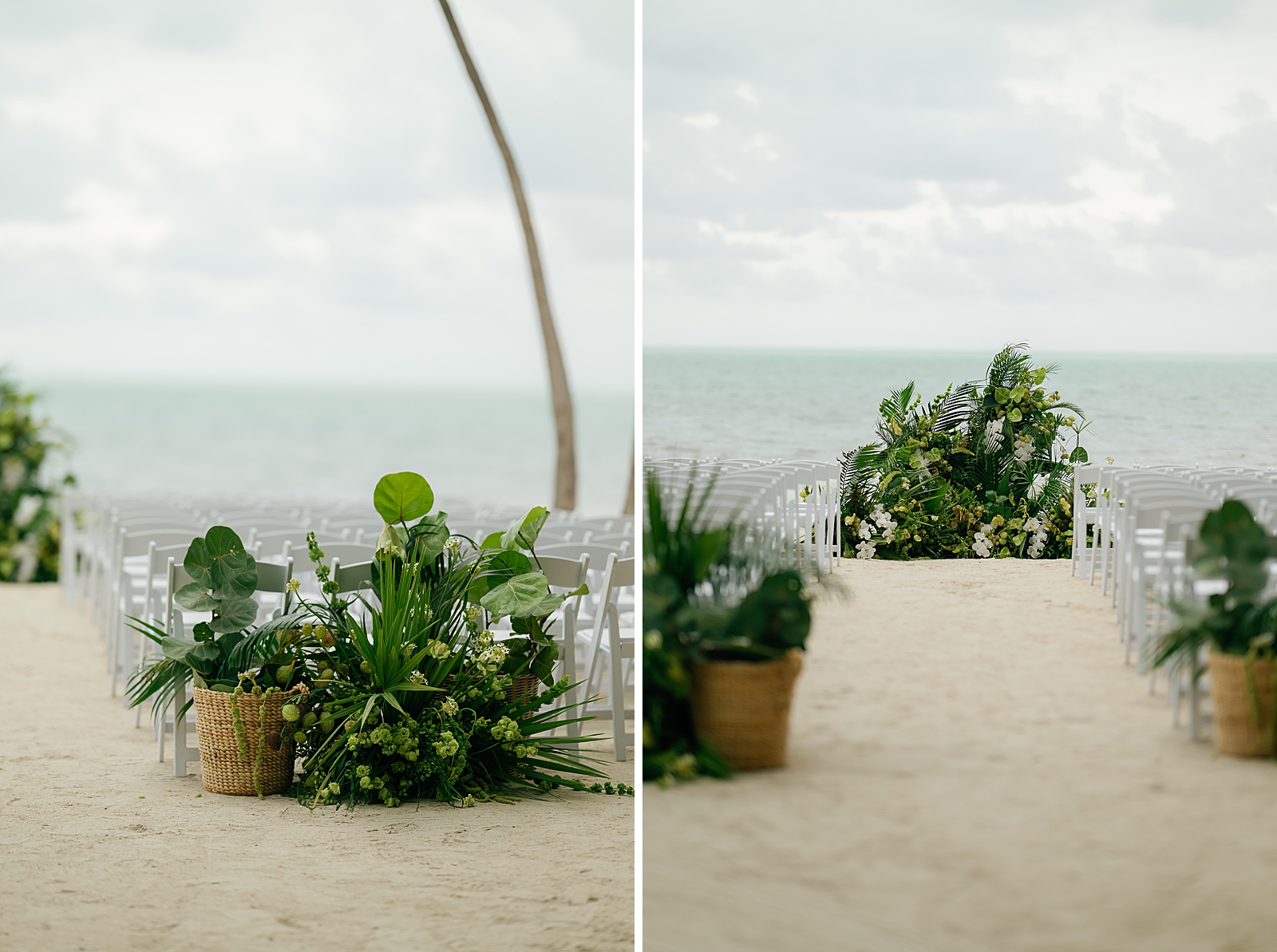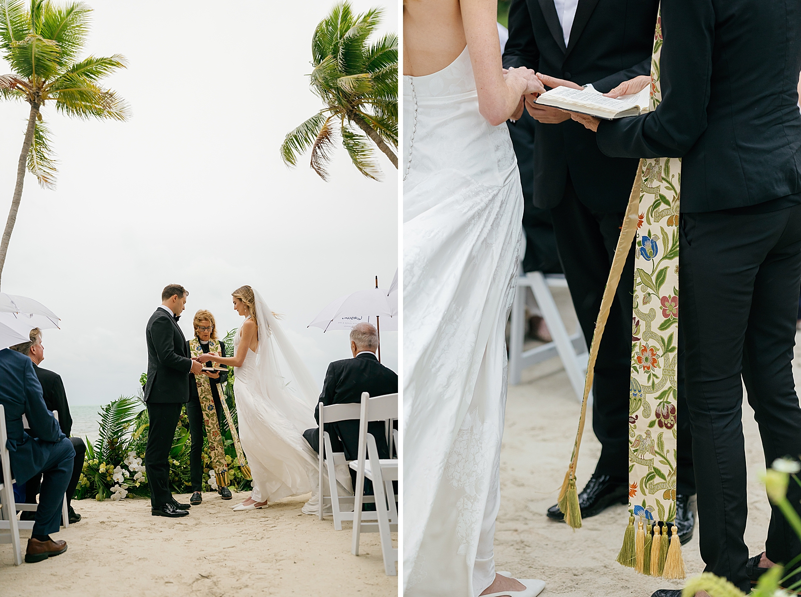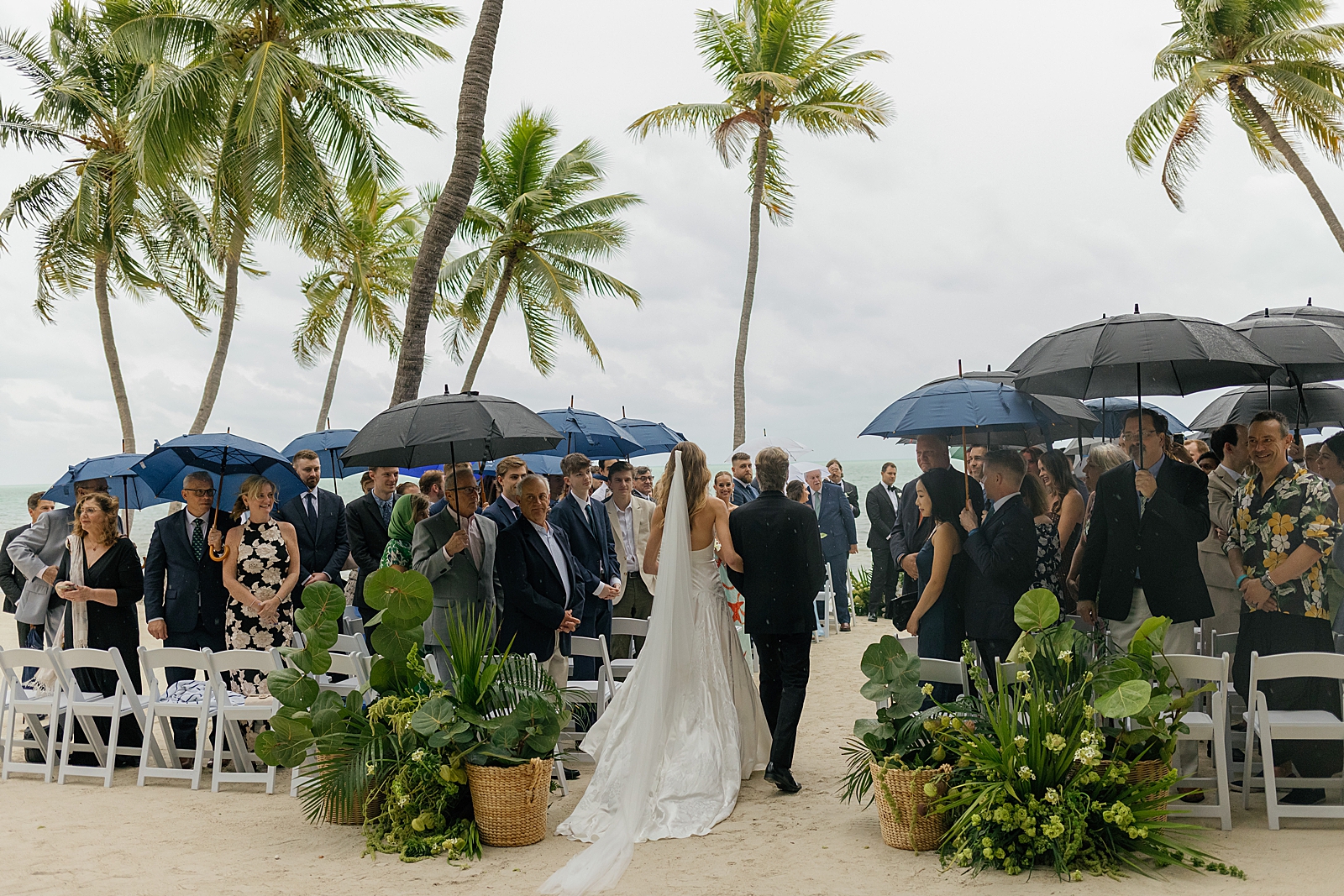 Set against the soft blues and greens of the Florida Keys, their beachfront ceremony took place directly on the sand, with the ocean just steps away. A gentle rain rolled in, casting a romantic haze over the day and giving the celebration an intimate, almost cinematic feel. Guests gathered close as Jamie and Andrew exchanged vows, the sound of the waves blending effortlessly with the quiet patter of rain.