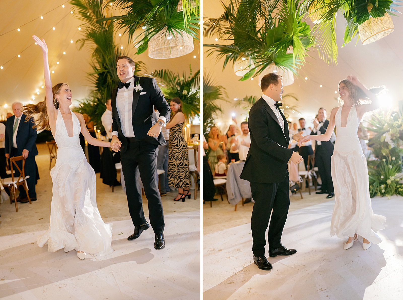 Following the ceremony, guests transitioned to a beautifully tented reception. The space felt airy and refined, with soft lighting and natural textures creating a welcoming atmosphere despite the weather. As the evening unfolded, the rain became more persistent, and plans shifted—moving the celebration from the tent indoors. What could have felt like a disruption instead became another seamless chapter of the day. The indoor space offered warmth, energy, and a cozy elegance that kept the celebration going without missing a beat.