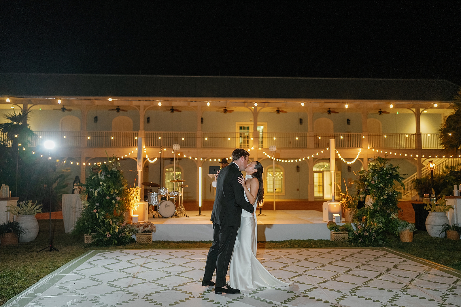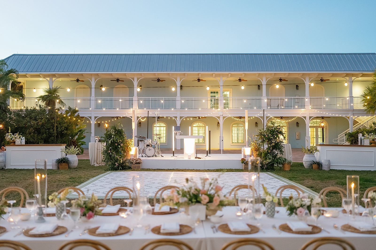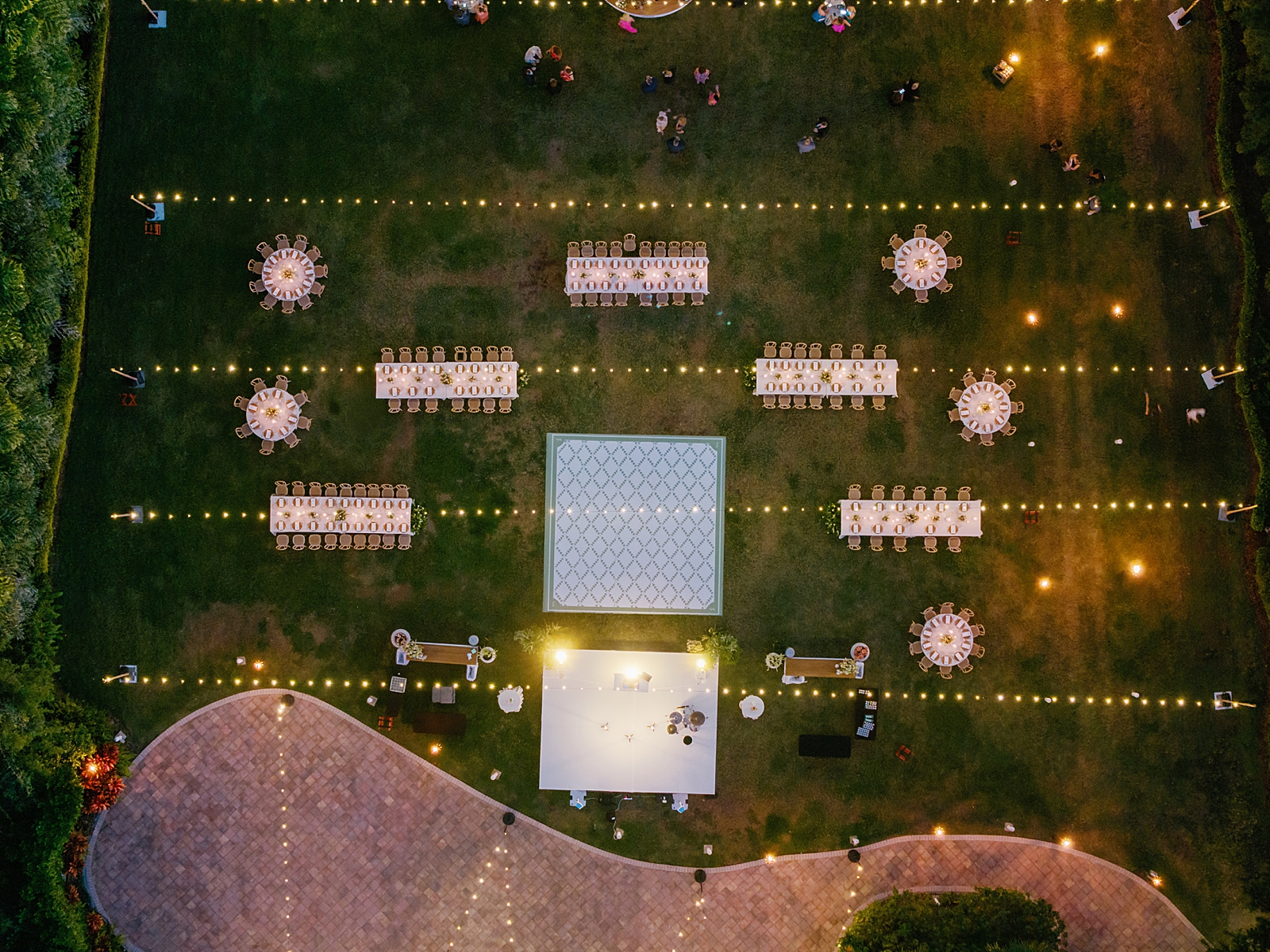 Dinner was served outside at sunset, beneath a canopy of string lights and candlelight, creating a warm, inviting ambiance that felt both magical and relaxed. A custom dance floor anchored the space, blending seamlessly into the open-air setting and inviting guests to stay, linger, and celebrate.