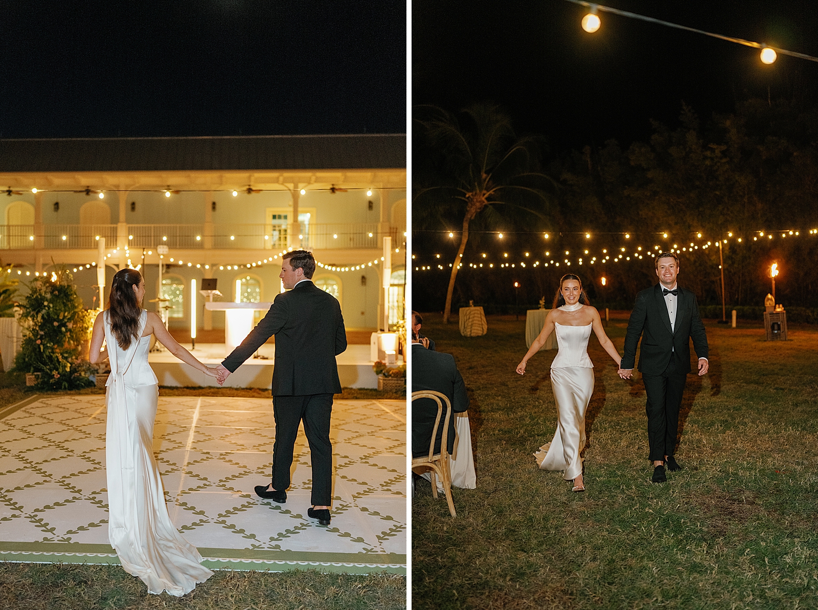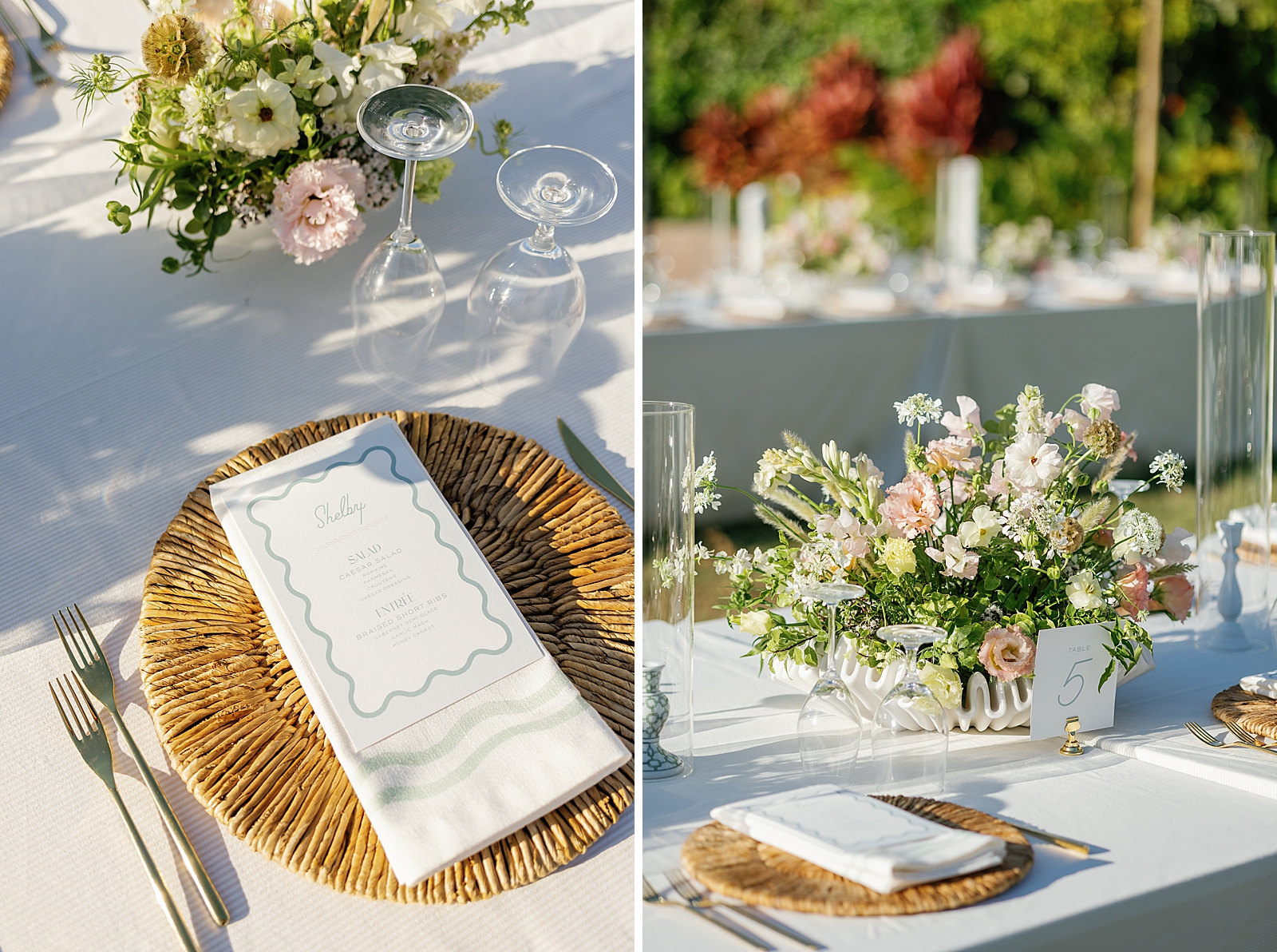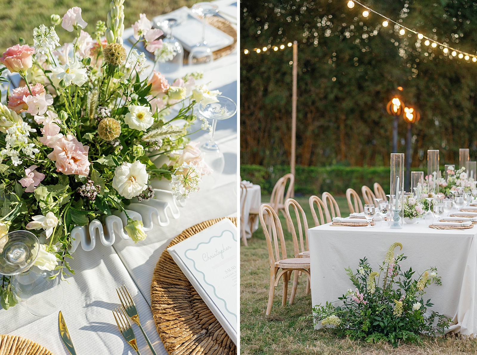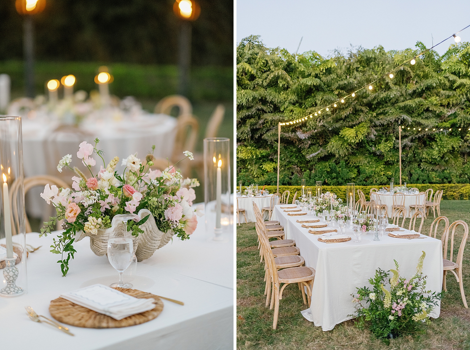 Dinner was served outside at sunset, beneath a canopy of string lights and candlelight, creating a warm, inviting ambiance that felt both magical and relaxed. A custom dance floor anchored the space, blending seamlessly into the open-air setting and inviting guests to stay, linger, and celebrate.