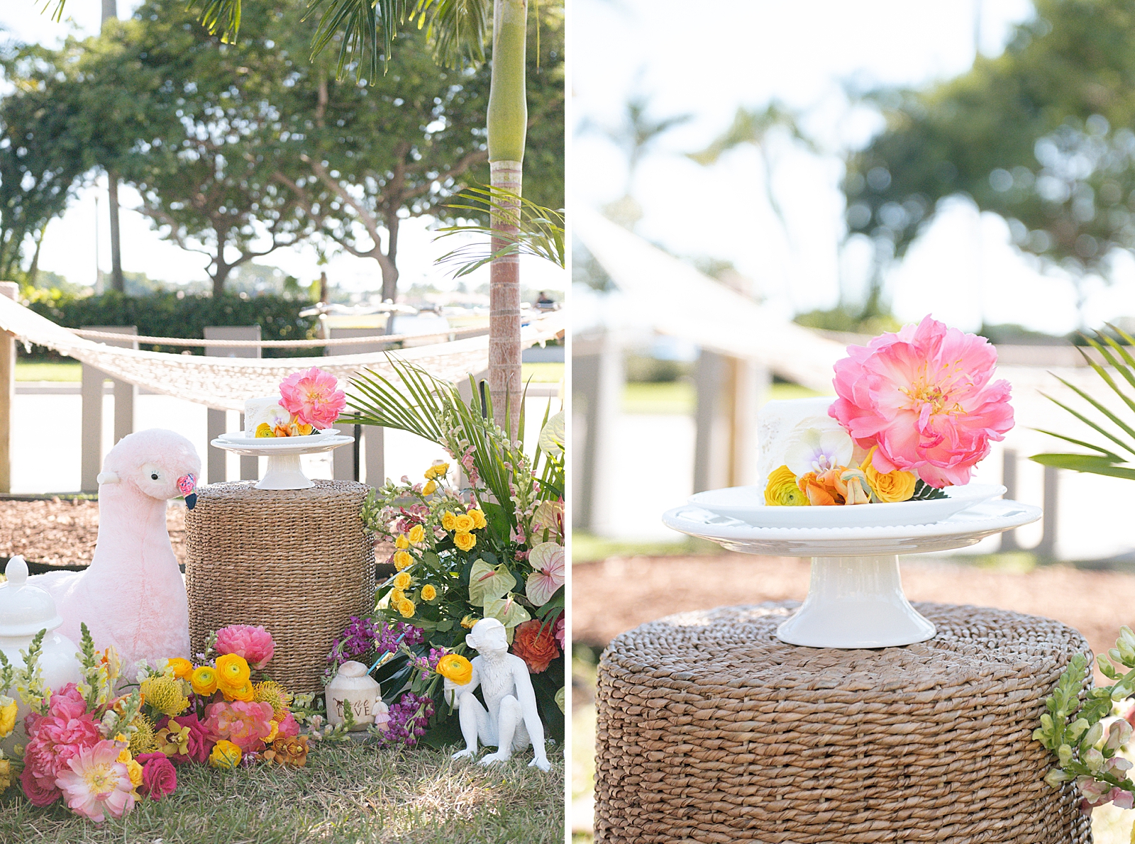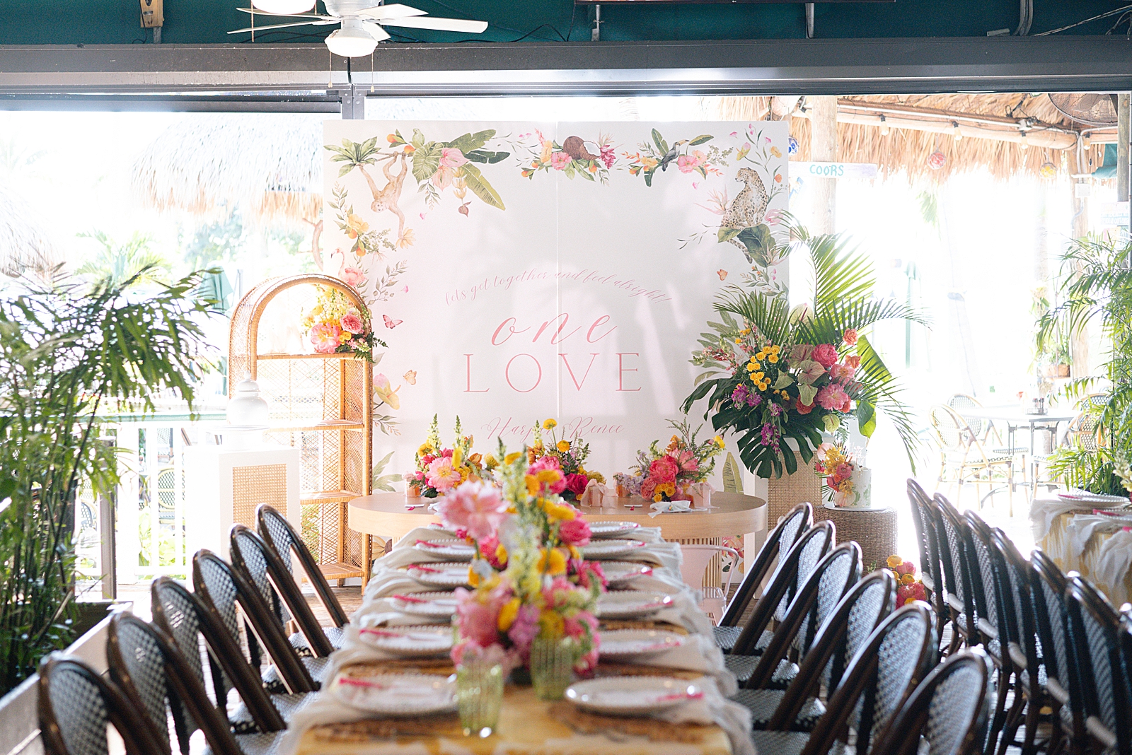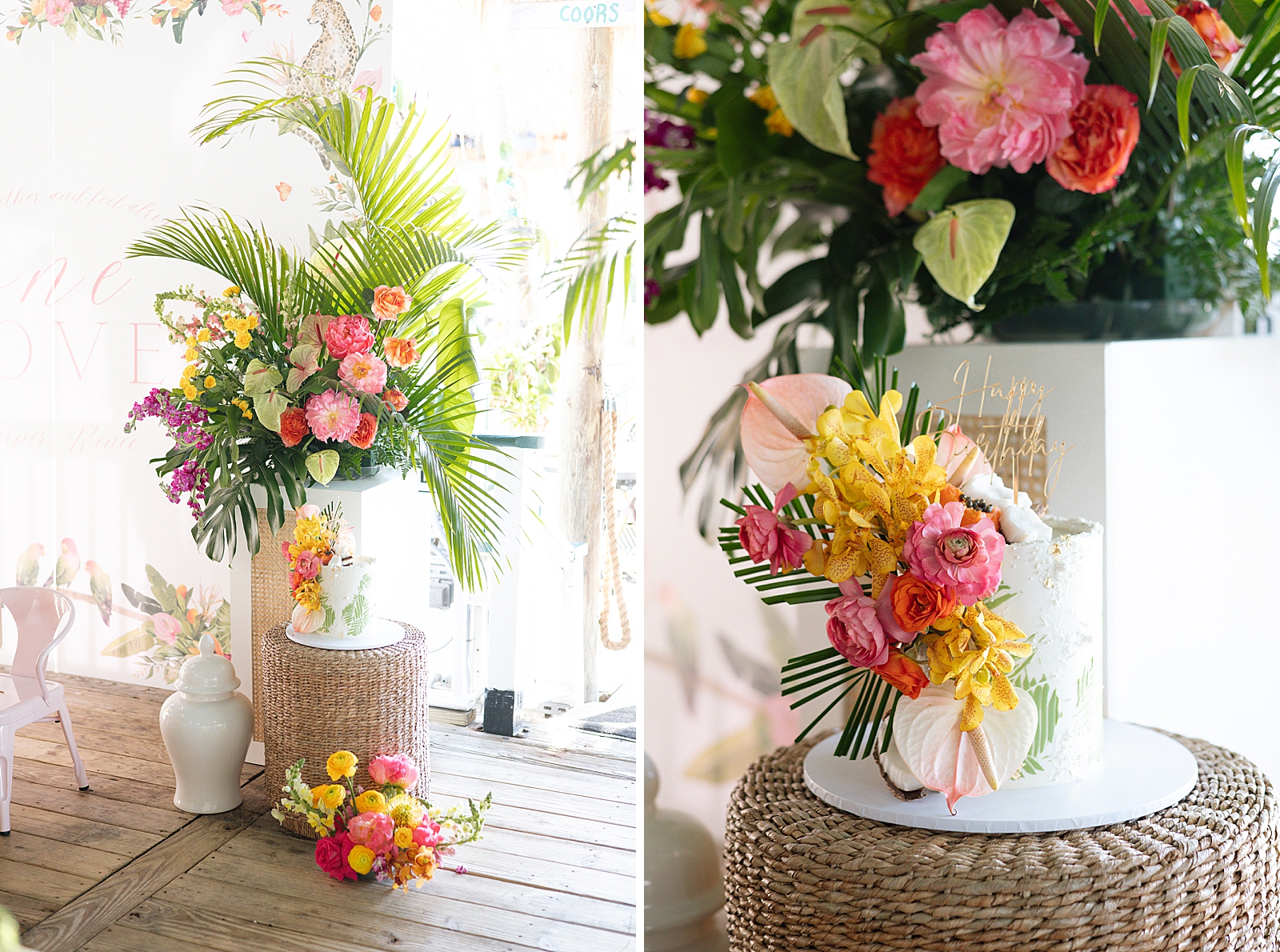 The design palette featured bright shades of pink, orange, yellow, and green, instantly setting the tone for a lively island-inspired celebration. Wicker and rattan accents were incorporated throughout the setup—from tabletop décor to display elements—adding texture and a relaxed coastal feel that perfectly complemented the waterfront setting.