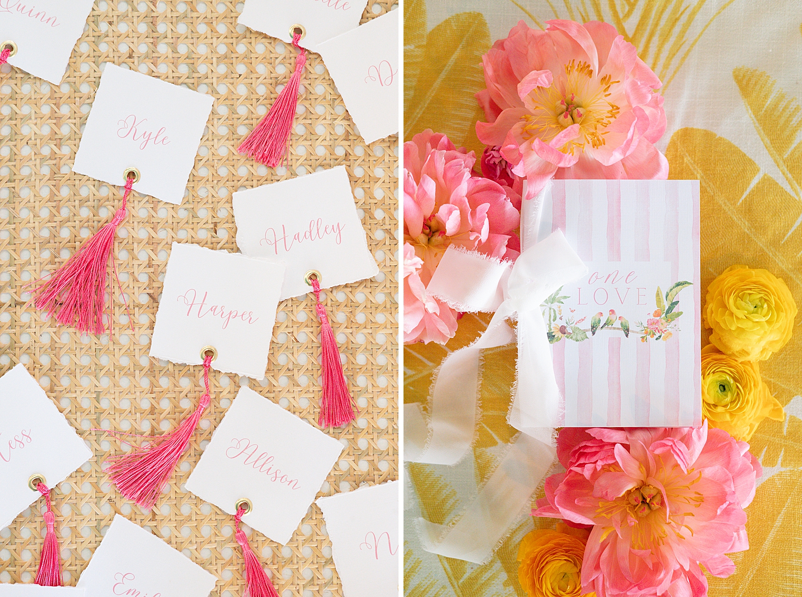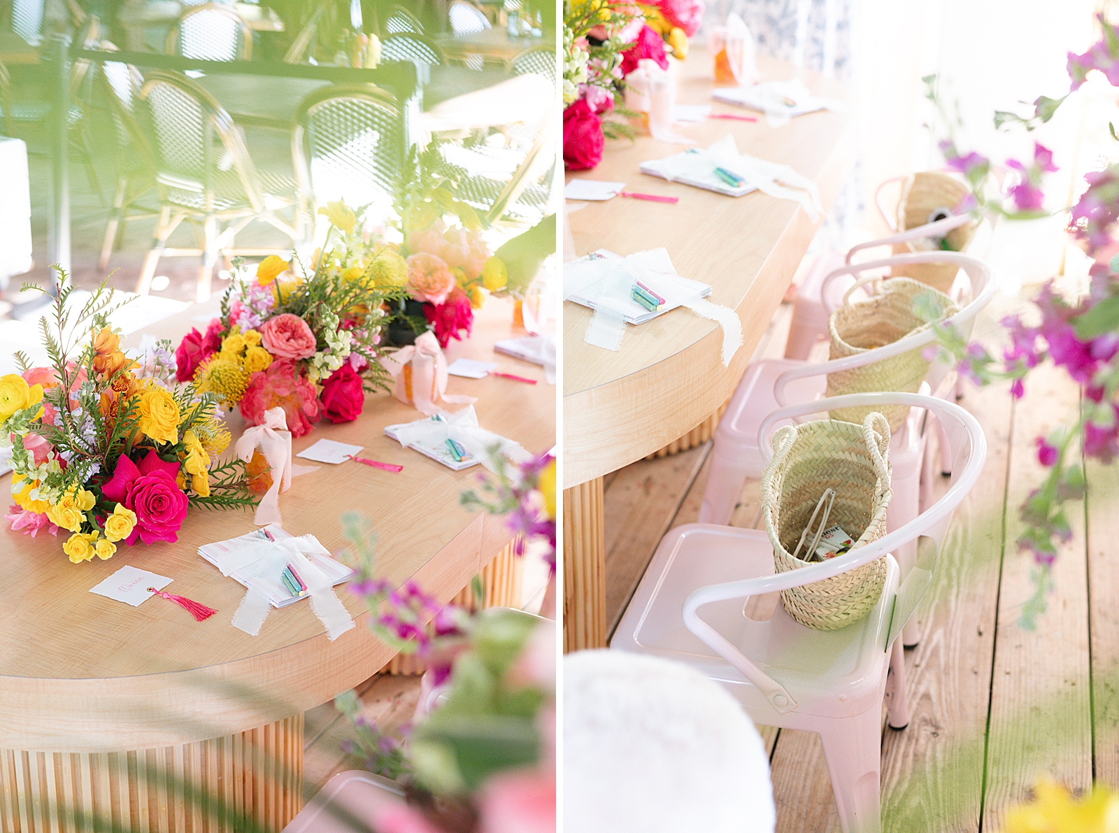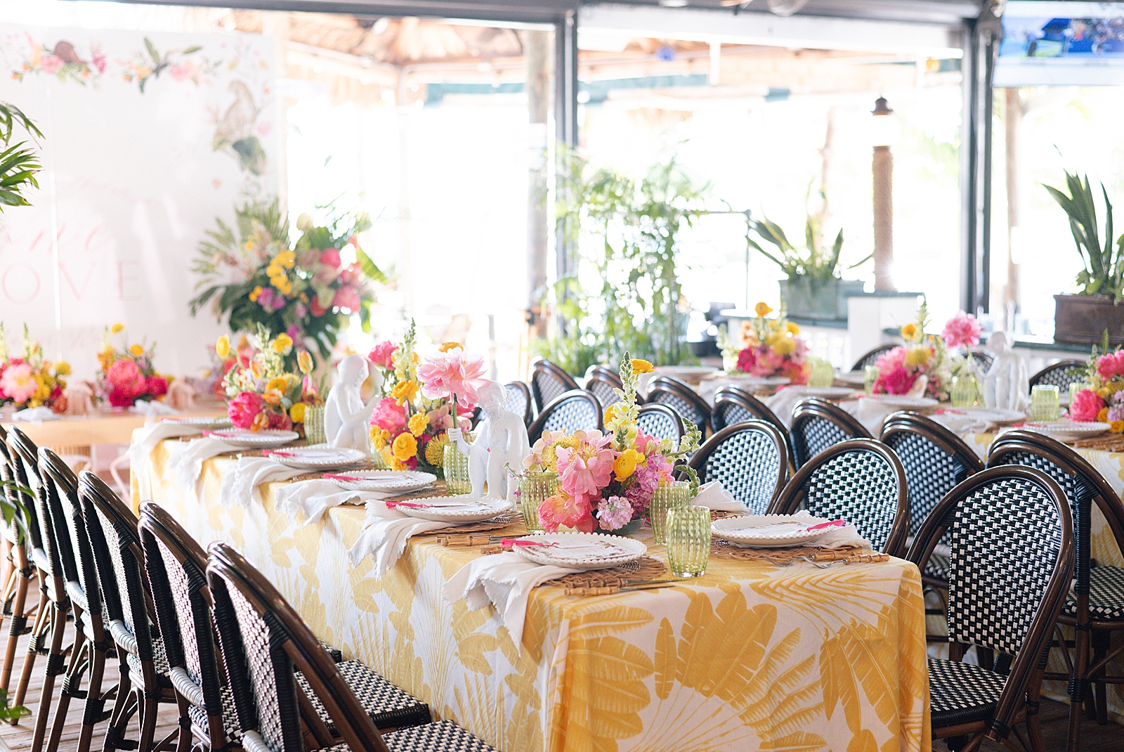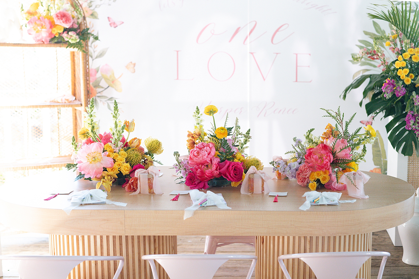 The design palette featured bright shades of pink, orange, yellow, and green, instantly setting the tone for a lively island-inspired celebration. Wicker and rattan accents were incorporated throughout the setup—from tabletop décor to display elements—adding texture and a relaxed coastal feel that perfectly complemented the waterfront setting.