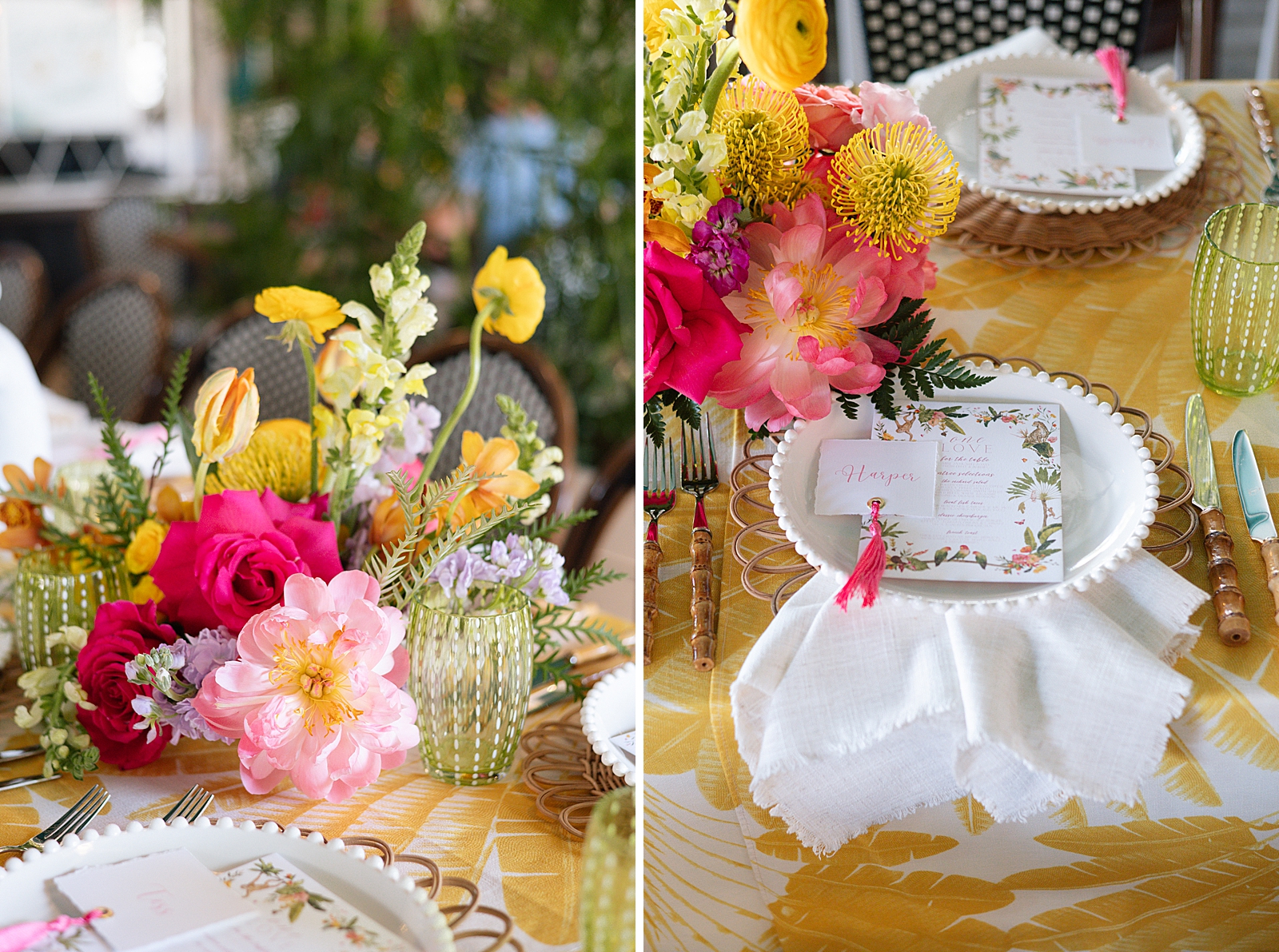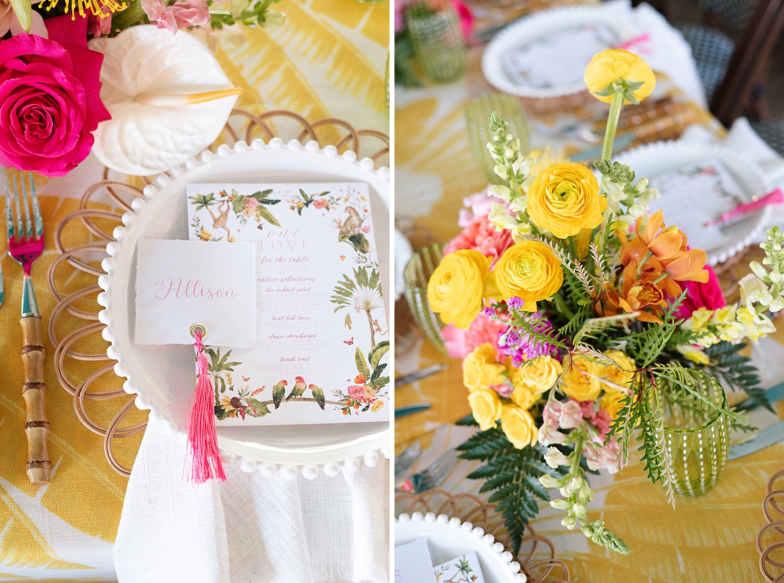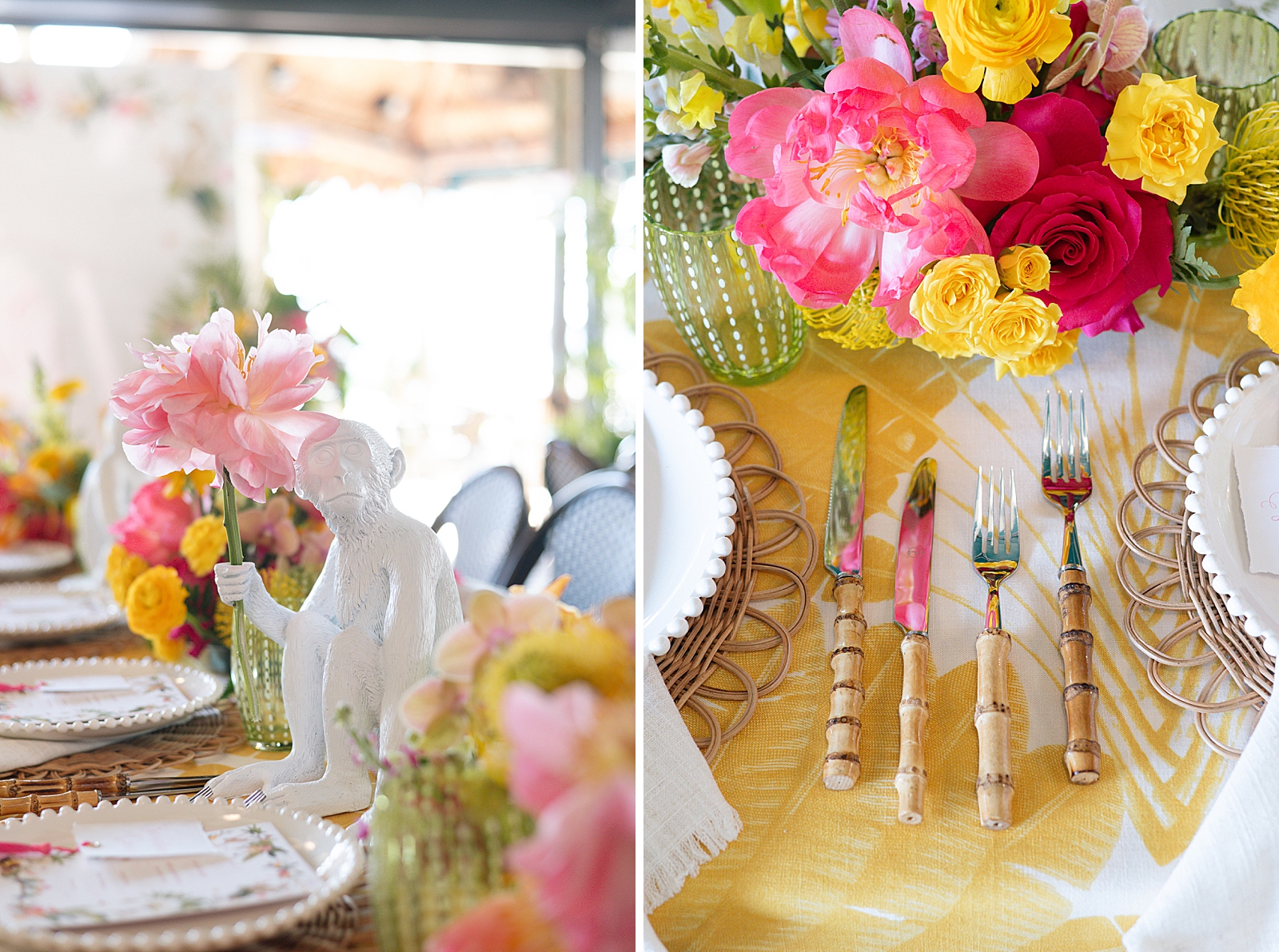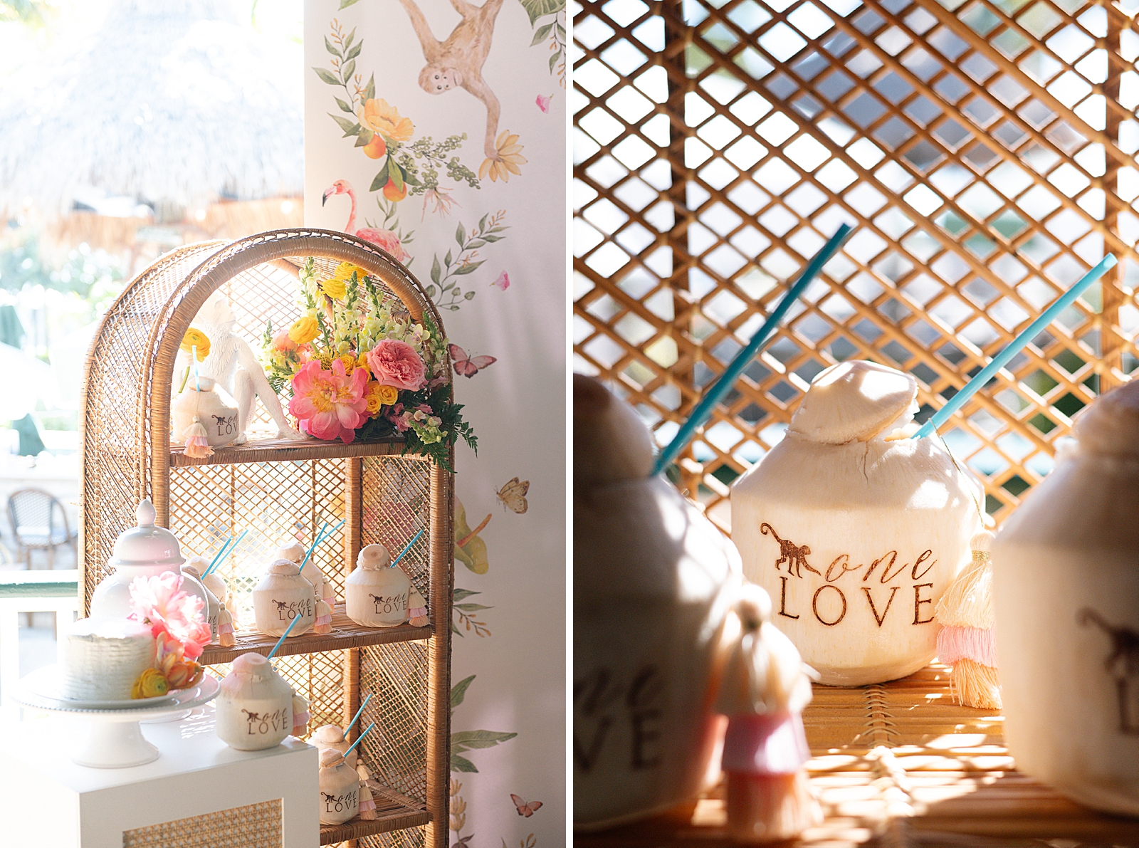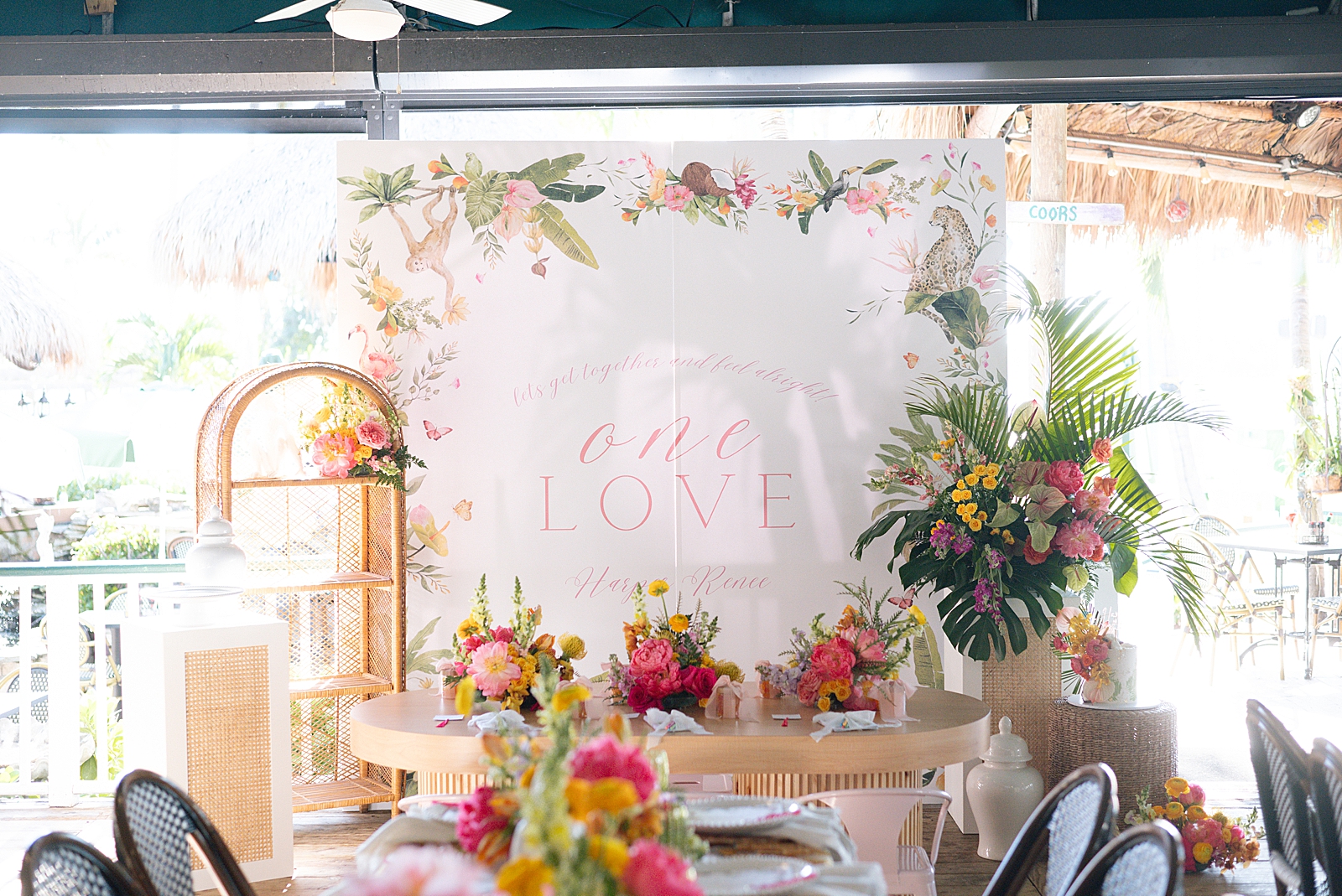 Guests gathered for a festive outdoor lunch while enjoying the colorful tropical atmosphere. Monkey accents were woven into the décor, bringing a fun and whimsical touch to the overall theme. From playful details on signage and table styling to themed décor elements, every design choice helped create a cohesive and joyful environment for family and friends.